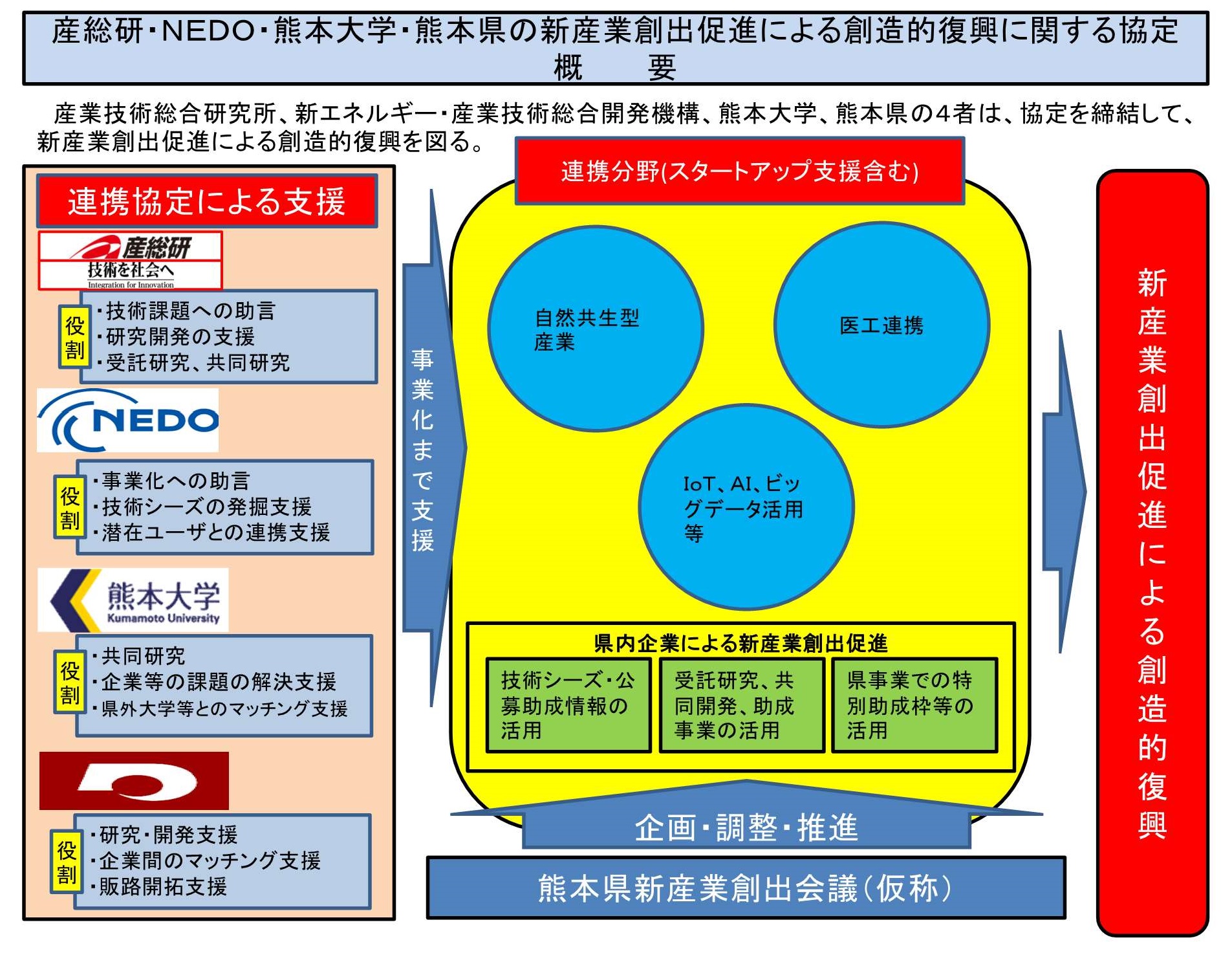4者は、協定に基づく取り組みを推進する会議(熊本県新産業創出会議(仮称))を設置して、新産業創出促進による熊本県内の産業の創造的復興を図ります。
